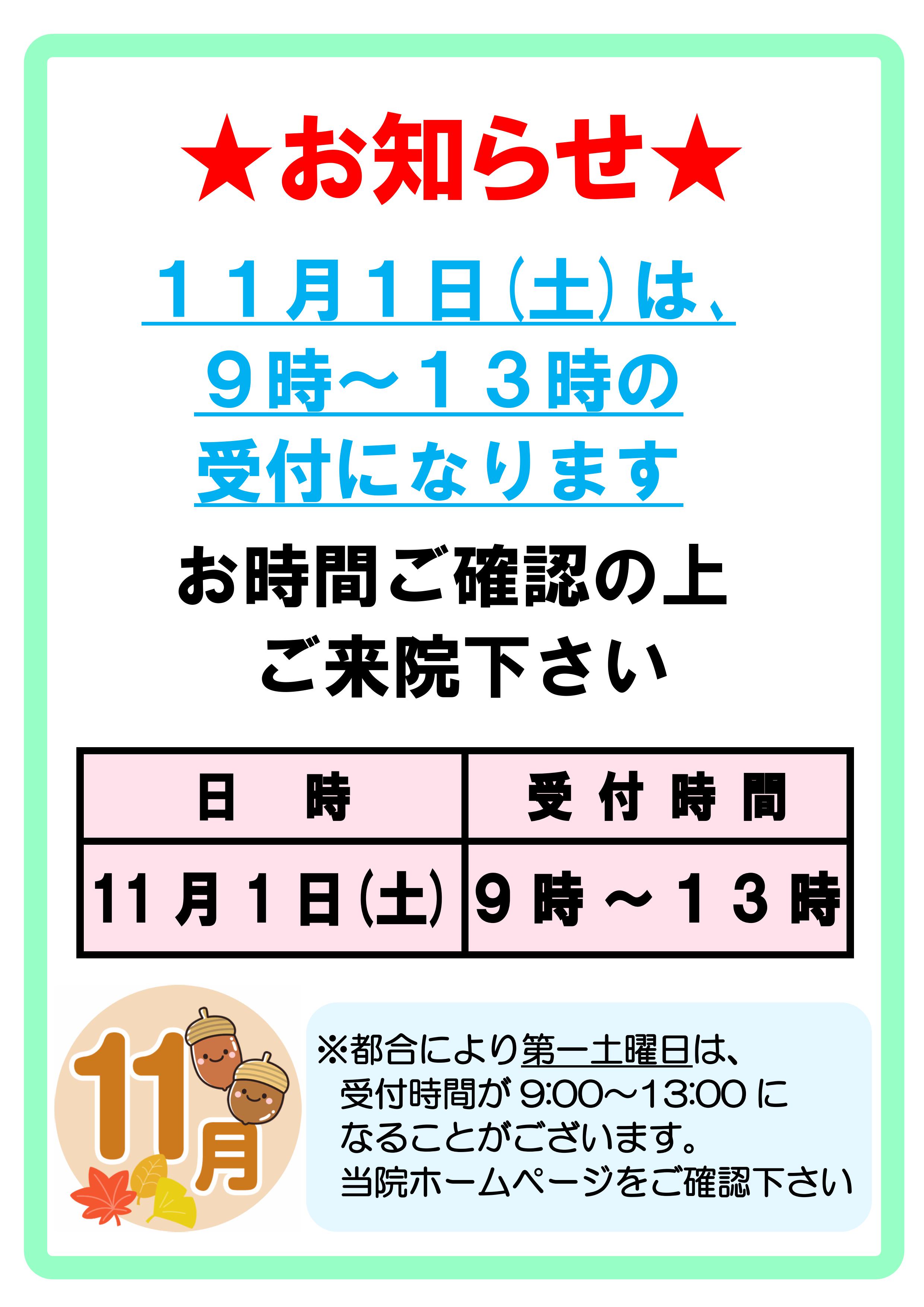 11月1日(土)の診療受付は13時までになります。